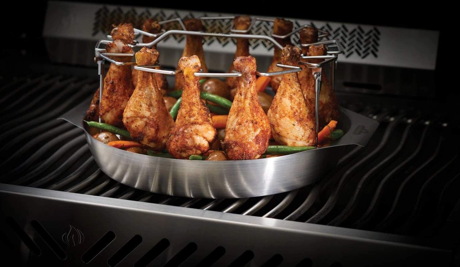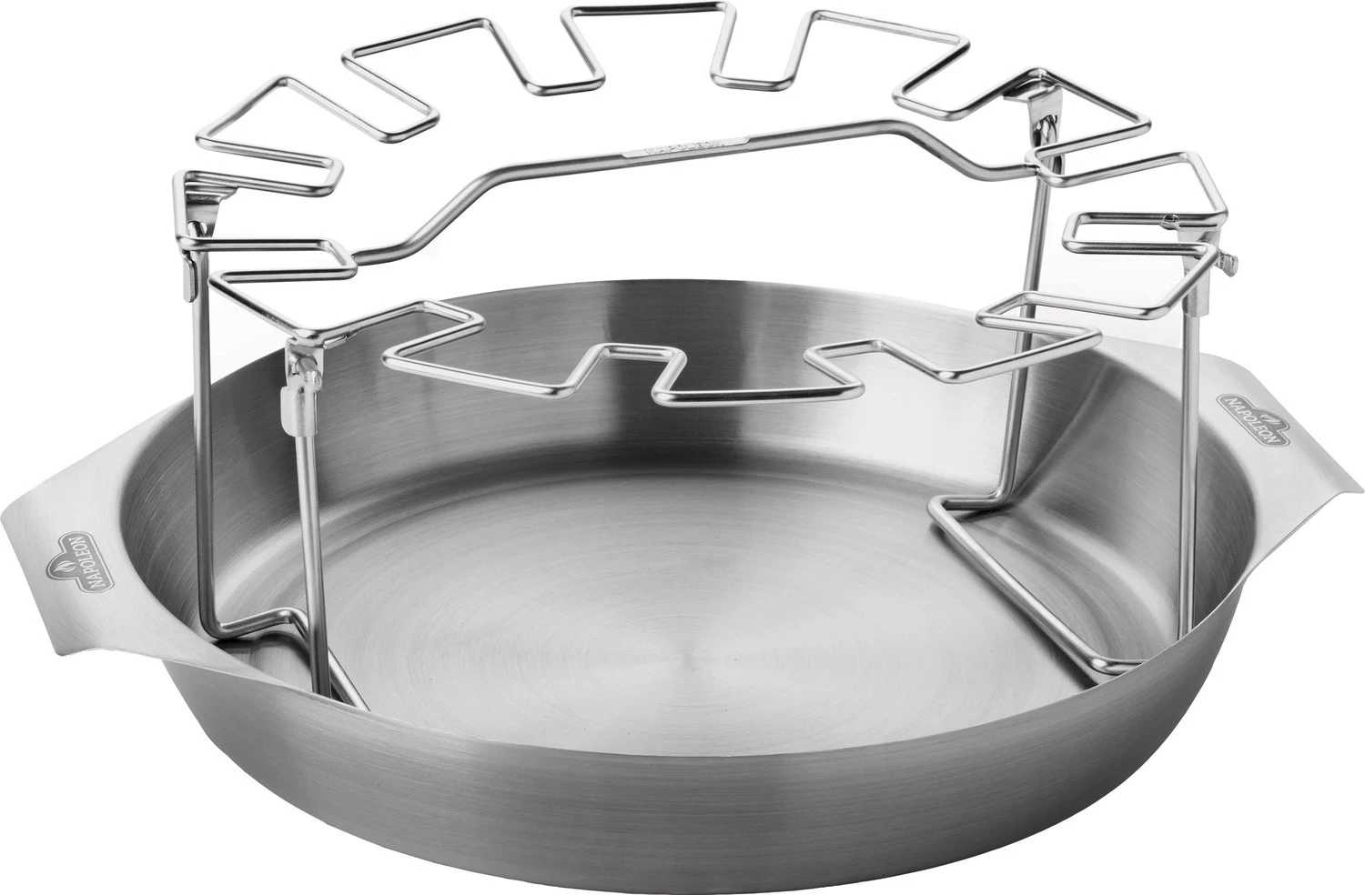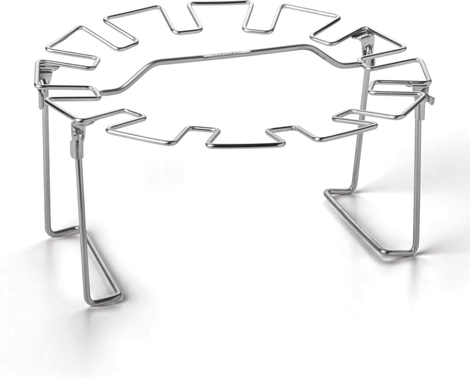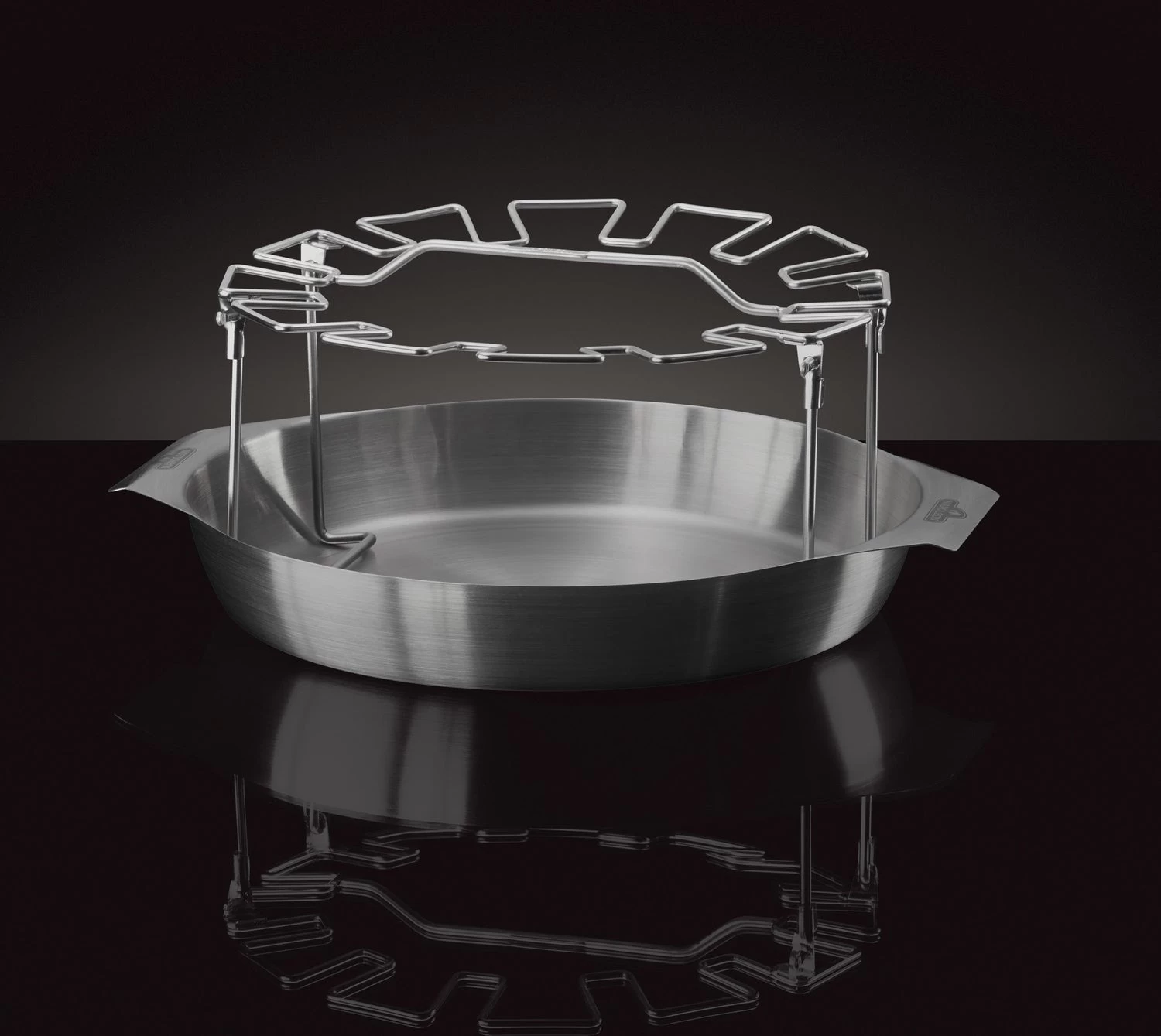 RVS drumstickhouder met opvouwbaar rek voor een gelijkmatige hitteverdeling. 12 gleuven voor kippenpoten of drumsticks. De schaal is ook los te gebruiken voor gerechten als paella.