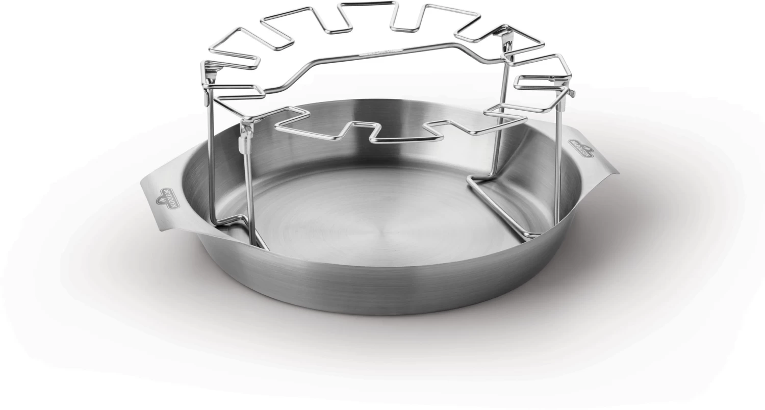 Deze handige grilltool van Napoleon biedt ruimte voor 12 kippenpoten of vleugels. Je hangt ze aan het hoge rek en grilt ze gelijkmatig. De bak eronder kan dienen als lekpan, opvangbak voor sappen of zelfs voor het bereiden van smakelijke bijgerechten op de barbecue. Het is raadzaam vuurvaste handschoenen te gebruiken bij het hanteren van de set op je grill. Als ze klaar zijn of als je alvast een stukje kip wilt proeven, gebruik dan een BBQ tang voor de barbecue. Zowel het rek als de bak zijn vervaardigd van roestvrij staal (rvs), waardoor deze Napoleon Drumstickhouder duurzaam is en geschikt voor reiniging in de vaatwasser. De pootjes van het rek zijn opvouwbaar, waardoor je de set eenvoudig kunt opbergen.