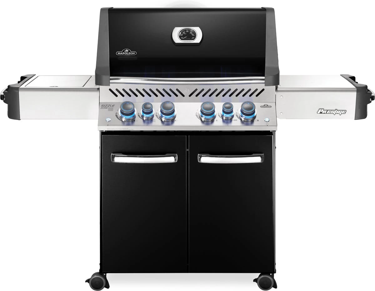 De Prestige® 500 propaangasbarbecue van Napoleon belichaamt ultieme veelzijdigheid. Met vier hoofdbranders, een infrarood zij- en achterbrander, biedt dit draagbare model acht unieke bereidingstechnieken. Het hoogwaardige roestvrijstalen ontwerp met een zwart geëmailleerd deksel straalt duurzaamheid uit. Iconische WAVE™-grillroosters en SIZZLE ZONE™ infrarood zijbrander leveren perfecte grillstrepen. SafetyGlow verlichting op de bedieningsknoppen zorgt voor veiligheid, terwijl de NIGHT LIGHT™ bedieningsknoppen bijdragen aan avondentertainment. Met een grilloppervlak van 71 x 46 cm, LIFT EASE™ deksel, infrarood draaispit-achterbrander, JETFIRE™-ontsteking en ACCU-PROBE™-thermometer biedt deze barbecue professionele resultaten. 25,7 kW.