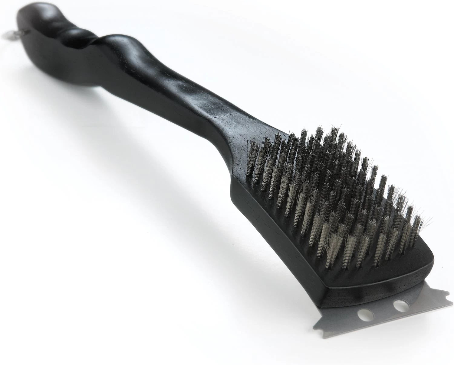 De ca. 45 cm lange barbecue borstel met RVS borstelharen houdt gietijzeren grillroosters schoon, met schaper en donkere houten steel.