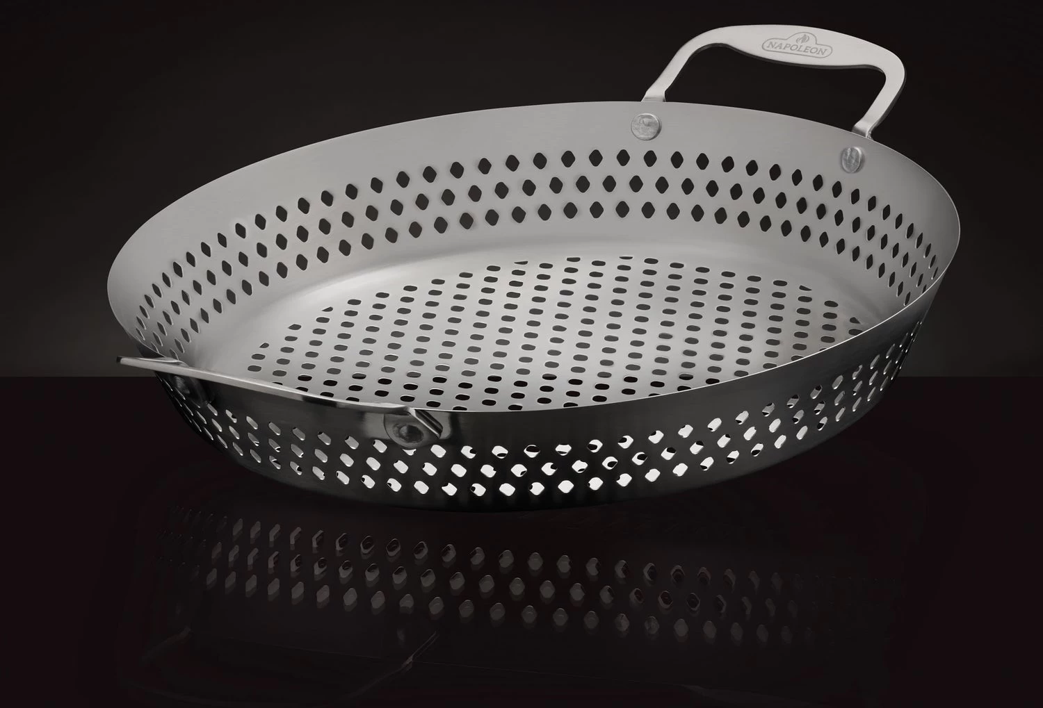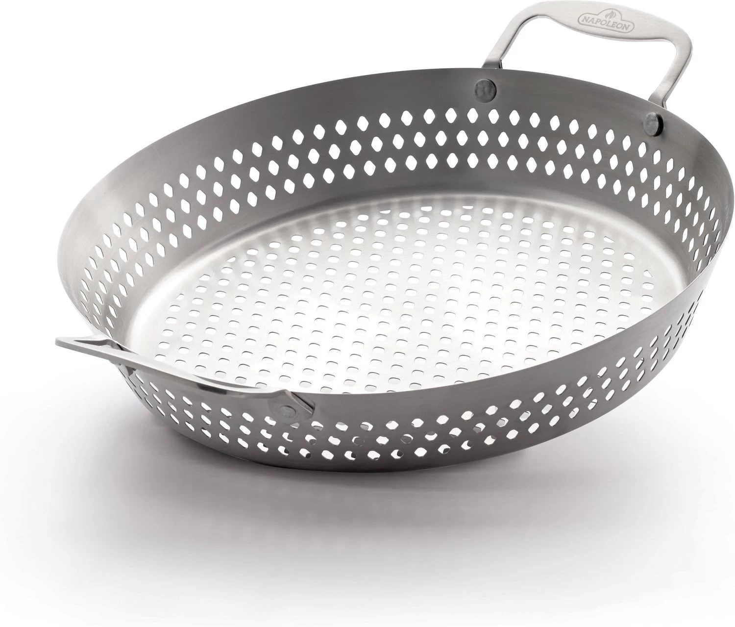 Deze grillkorf voorkomt het dat klein voedsel door het rooster heen valt. Perfect voor zeevruchten, groenten of roerbak. Incl. handgrepen. 12.75″ x 2″ (Ø 32 cm x H 5 cm)