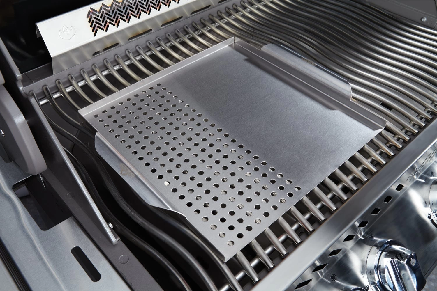 Vierkante RVS groentemand/grillplaat met handvaten voor het eenvoudig optillen incl. een cederhouten rookplank. Een helft is een gesloten plaat voor het grillen van kleinere producten, de andere helft is met gaatjes voor het grillen van groente.